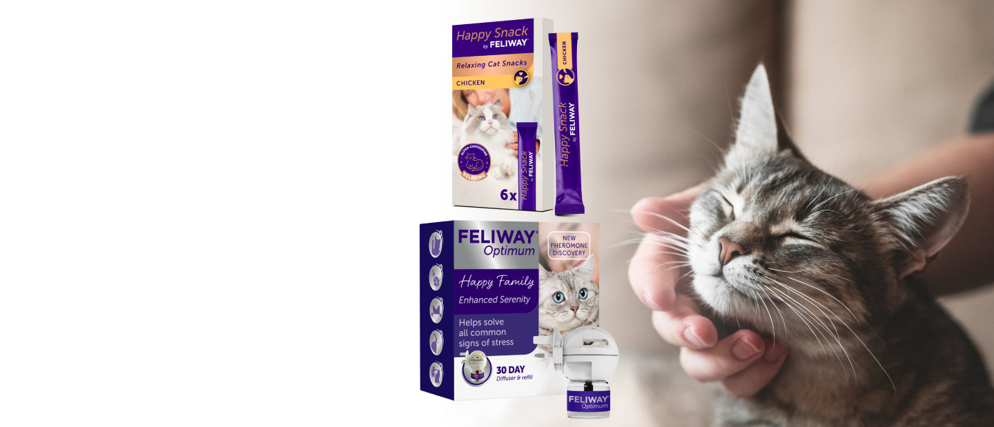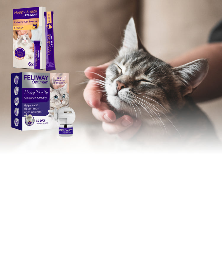 Our range of pheromone-based products is designed to support cats through all of life’s challenges: FELIWAY Optimum – our most advanced calming solution, offering enhanced serenity and reducing more signs of stress. FELIWAY Classic – our original pheromone to help reduce signs of stress like scratching and spraying. FELIWAY Friends – promotes harmony between cats living together. FELIWAY Help! – a convenient 7-day support for temporary stressful situations like travel or visitors. The latest addition to the range is Happy Snack by FELIWAY® – a delicious way to support your cat’s emotional balance. These tasty treats contain a natural milk protein with calming properties, offering a gentle option to help reduce everyday stress and build your bond with your cat.
