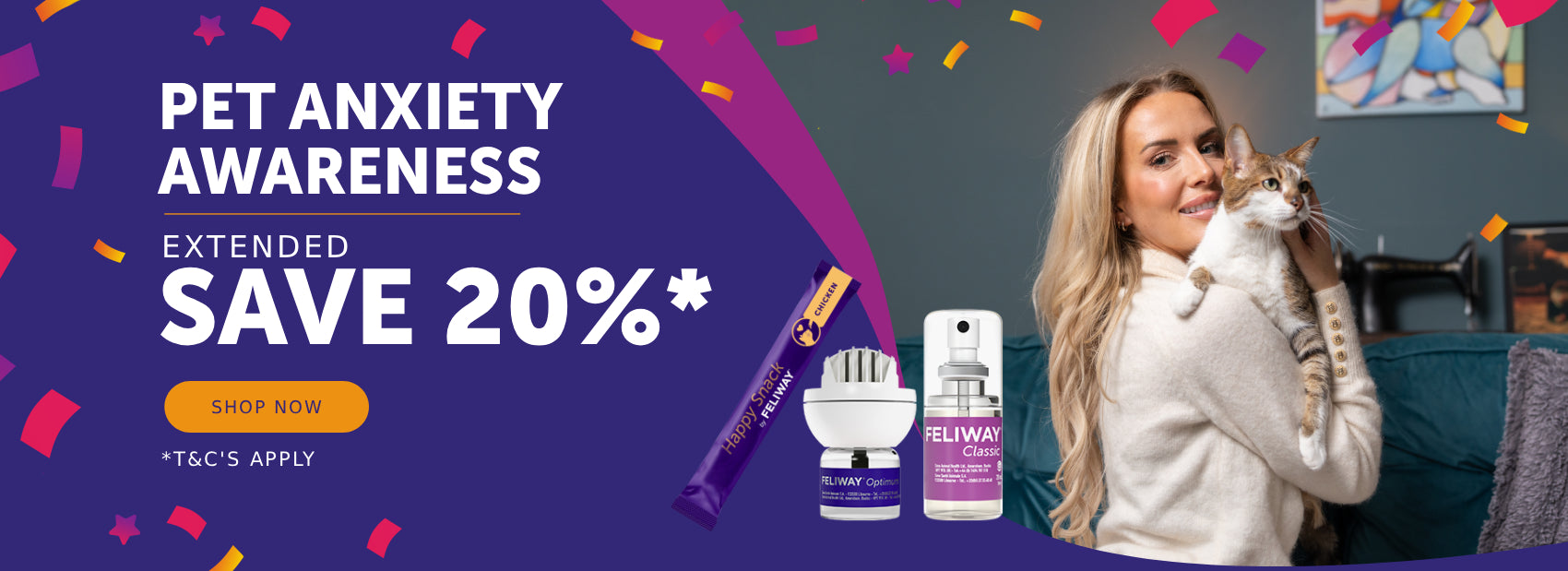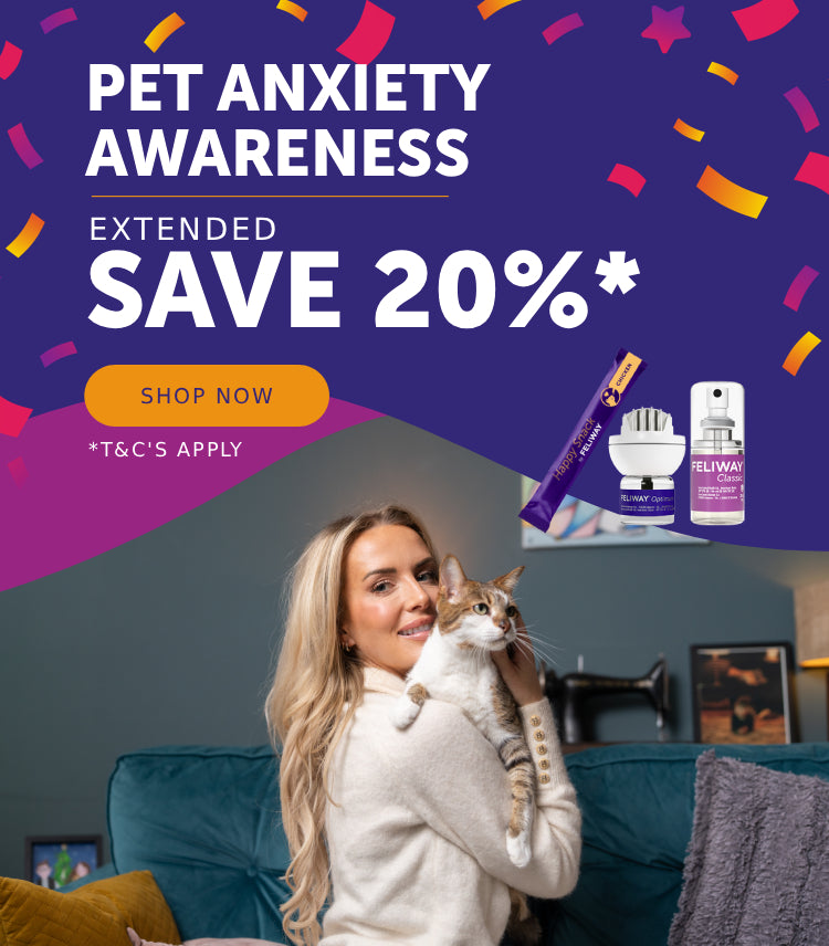 *Offer valid from 1st March to 30th April 2026. 20% off FELIWAY Optimum Diffuser, Classic Diffuser, Friends Diffuser, Feliway Help, Classic Sprays 60ml, Cystease 300 pills and Happy Snack 24 sticks. Excludes all Refills, Happy Snack 6 sticks, Classic Sprays 20ml and Cystease 30 pills. Not valid on subscriptions. No cash alternative. Offer is subject to stock availability and can be withdrawn at any time. Cannot be combined with any other discounts or promotions. Valid only once per customer on a single purchase.