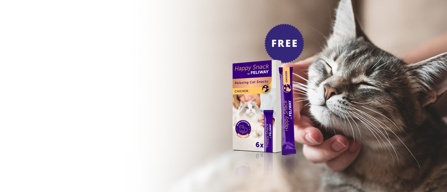 *One (1) box of Happy Snack 6 Sticks in Chicken flavour when you spend over £49.99 on any other products on feliway.co.uk - Offer valid from 16th to 28th February. 2026. No cash alternative. Offer is subject to stock availability and can be withdrawn at any time. Cannot be combined with any other discounts or promotions. Discount automatically applies when qualifying products are added to the basket. Valid only once per customer on a single purchase.