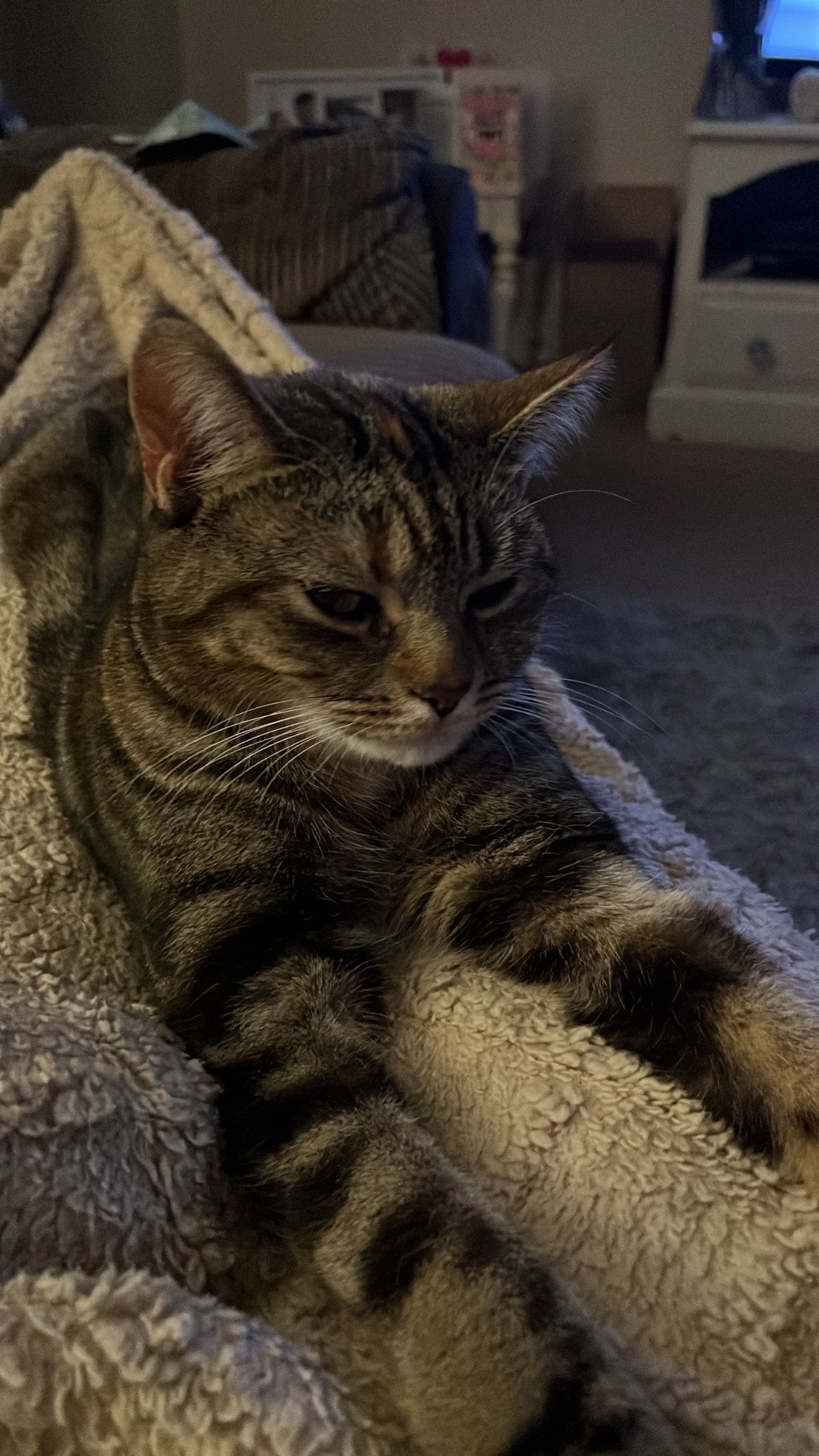 Mercy is 11 years old she is such a loving cat loves lots of cuddles her favourite place is my lap loves to lay on there. Mercy gets a little anxious at night so we got Feliway plug in and itโs has worked a treat she is more settled at night.